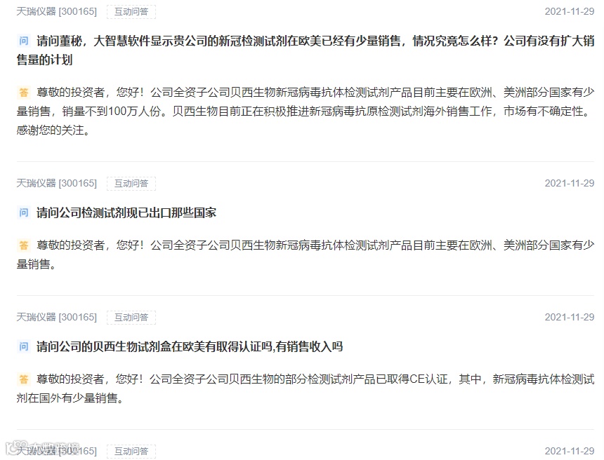 11月29日,天瑞仪器在互动平台上回答多个投资者的提问称,全资子公司贝西生物的部分检测试剂产品已取得CE认证,贝西生物新冠病毒抗体检测试剂产品目前主要在欧洲、美洲部分国家少量销售,销量不到100万人份。贝西生物目前正在积极推进新冠病毒抗原检测试剂海外销售工作,市场有不确定性。