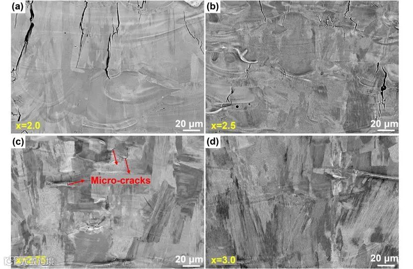 SLM打印HEA的结构特点主要体现在两方面:宏观缺陷和微观结构。空洞型缺陷是SLM中最常见的缺陷,如未凝固的颗粒和孔洞。作为一种成分复杂的新型材料,HEAs易产生孔隙缺陷,且其是造成密度损失的主要原因。通过改变打印参数提高体积能量密度能够有效的抑制孔洞的产生,如图2所示。裂纹是另一种常发的缺陷,与合金成分有密切联系,如增加AlCrCuFeNi中Ni元素的成分可以有效的抑制裂纹,如图3所示。由于HEA元素种类较多,调控元素成分控制裂纹的研究将会非常丰富。此外,元素偏析、夹渣等典型的增材制造缺陷也会出现在SLM打印的HEA中。