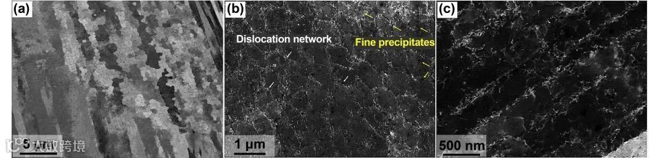 由于SLM工艺具有复杂的热循环和极高的冷却速率(106K/s),其制备的HEA晶粒的尺寸低至几微米,且可以产生很高密度的位错、亚晶界、纳米孪晶等,如图4所示,这将极大提升HEA机械性能。另一个显著特点是SLM打印的HEA更容易产生析出相。传统工艺制造的HEA需要较长时间的热处理来产生析出相,而SLM打印HEA晶格的多界面或多缺陷特征为析出相提供了理想的生长载体,只需较短时间的热处理或不热处理即可得到析出相。合金成分对于性能的影响至关重要。此外,对SLM打印的HEA进行后续热处理,还可以产生孪晶(如图5所示)等微观结构。