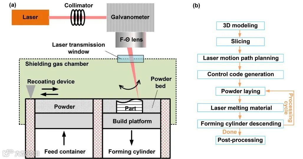 高熵合金(HEA)具有良好的极端环境力学性能和抗腐蚀、催化、储氢等功能性能,具有广泛的应用前景。这些应用领域多涉及高比表面积的孔隙、薄壁结构,力学拓扑优化的周期结构等复杂结构,因此HEA需要合适的成型技术以满足复杂结构制造需求。传统的机加工技术成型高强高韧性材料非常困难,复杂的空心、周期一体化结构也几乎不能实现。增材制造则可以满足复杂结构制造需求。选区激光熔化(SLM)作为应用最广泛的复杂结构增材制造技术具有同步合成和成型材料的优点,克服了传统加工方法的局限性,图1展示了SLM装置和流程示意图。此外,SLM冷却速率可以达到104-106K/s,远远超过传统工艺,因此,SLM可以产生更细的晶粒和晶粒内部的亚结构,从而提高最终构件的整体力学性能。