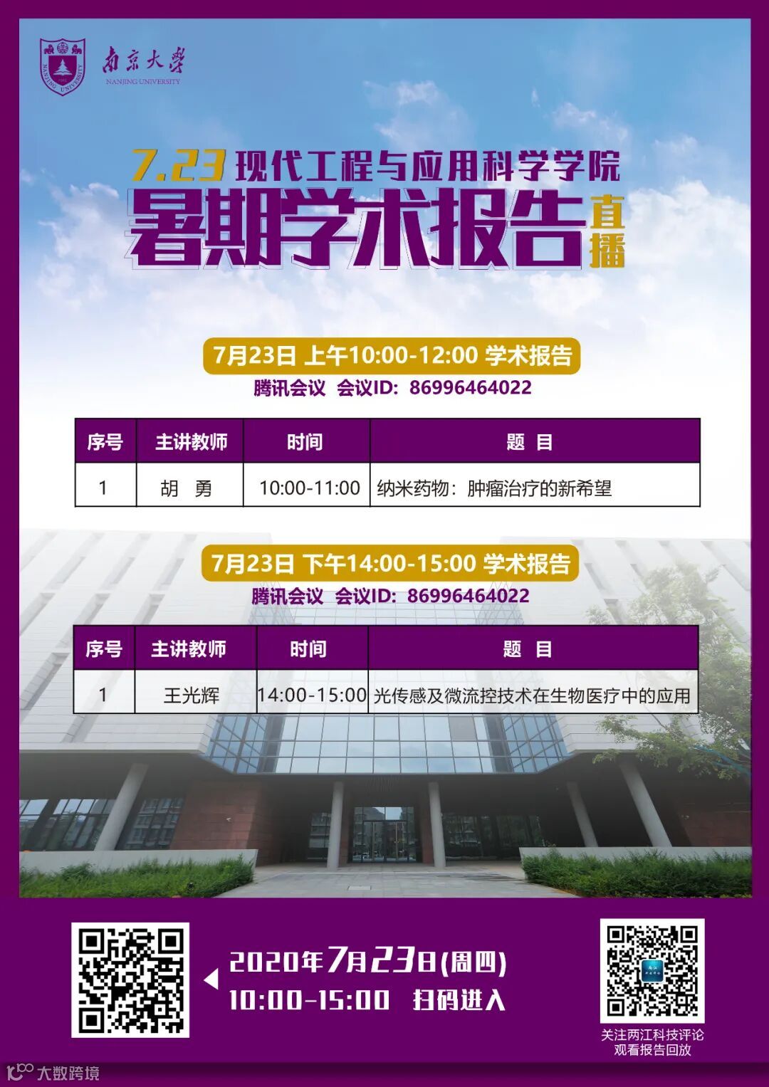 此次以“南京大学现代工程与应用科学学院暑期名师论讲坛”为主题的在线直播论坛于北京时间7月20日下午2时在两江科技评论直播间正式上线与您相见,此次论坛周期为7月20日——7月24日,敬请关注。