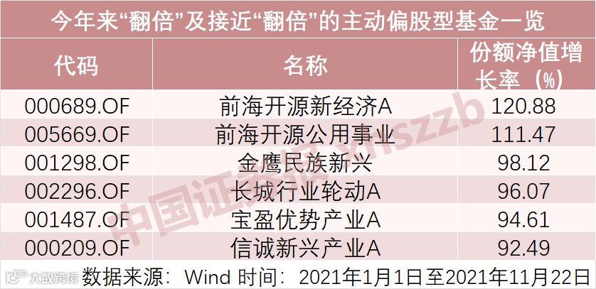 临近年末,主动偏股型基金排名收官战愈加激烈。截至11月22日,今年来仅有的两只“翻倍基”——前海开源新经济A和前海开源公用事业,竟被同一位基金经理崔宸龙包揽。这与前年和去年广发基金刘格菘、农银汇理基金赵诣“霸榜”的情形相似。