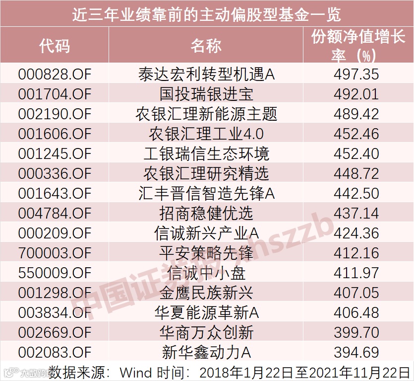 拉长时间来看,自2018年11月23日以来,A股市场开启了两年多震荡上行的结构性牛市。Wind数据显示,近三年主动偏股型基金平均收益率达到124.90%,远超同期上证指数、深证成指、沪深300的表现。其中,泰达宏利转型机遇A以497.35%的收益率居主动偏股型基金第一,该基金由基金经理王鹏管理。