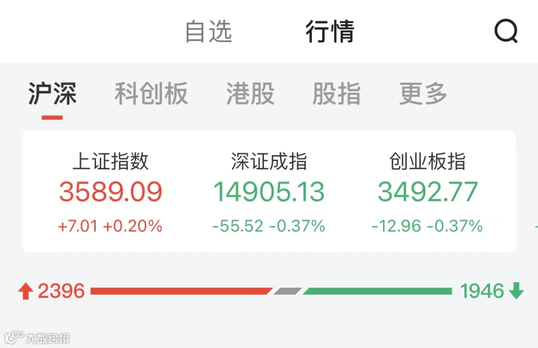 截至今日收盘,上证指数涨0.20%,报3589.09点;深证成指跌0.37%,报14905.13点;创业板指跌0.37%,报3492.77点。