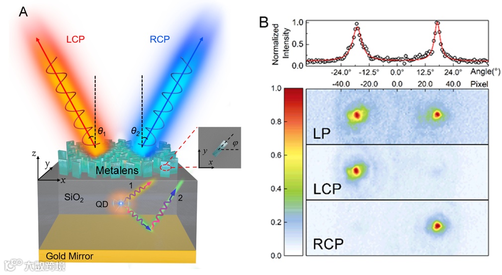 图1: (A)超构表面结构调控量子点辐射示意图。(B)实验测量远场辐射图。