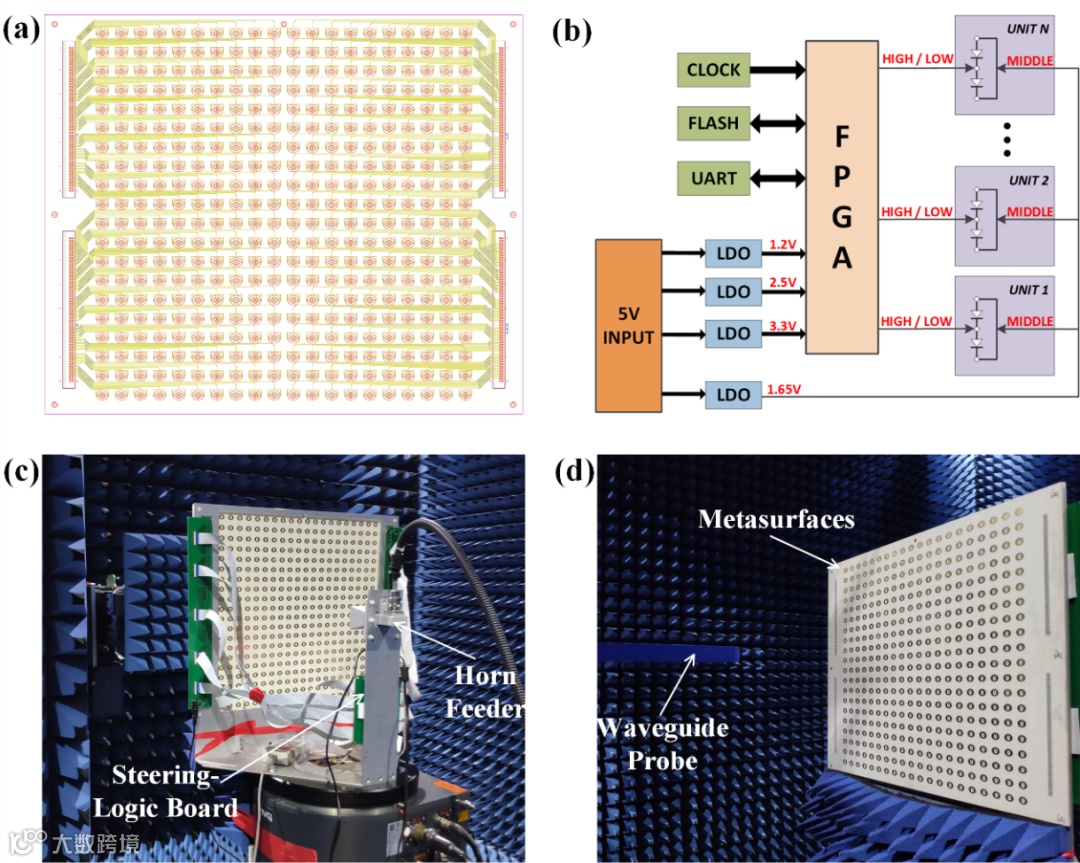 图4 (a)偏置层网络布局,(b)逻辑控制板设计原理图,(c)透射式数字超表面整体实物图,(d)透射式数字超表面暗室测试场景图。