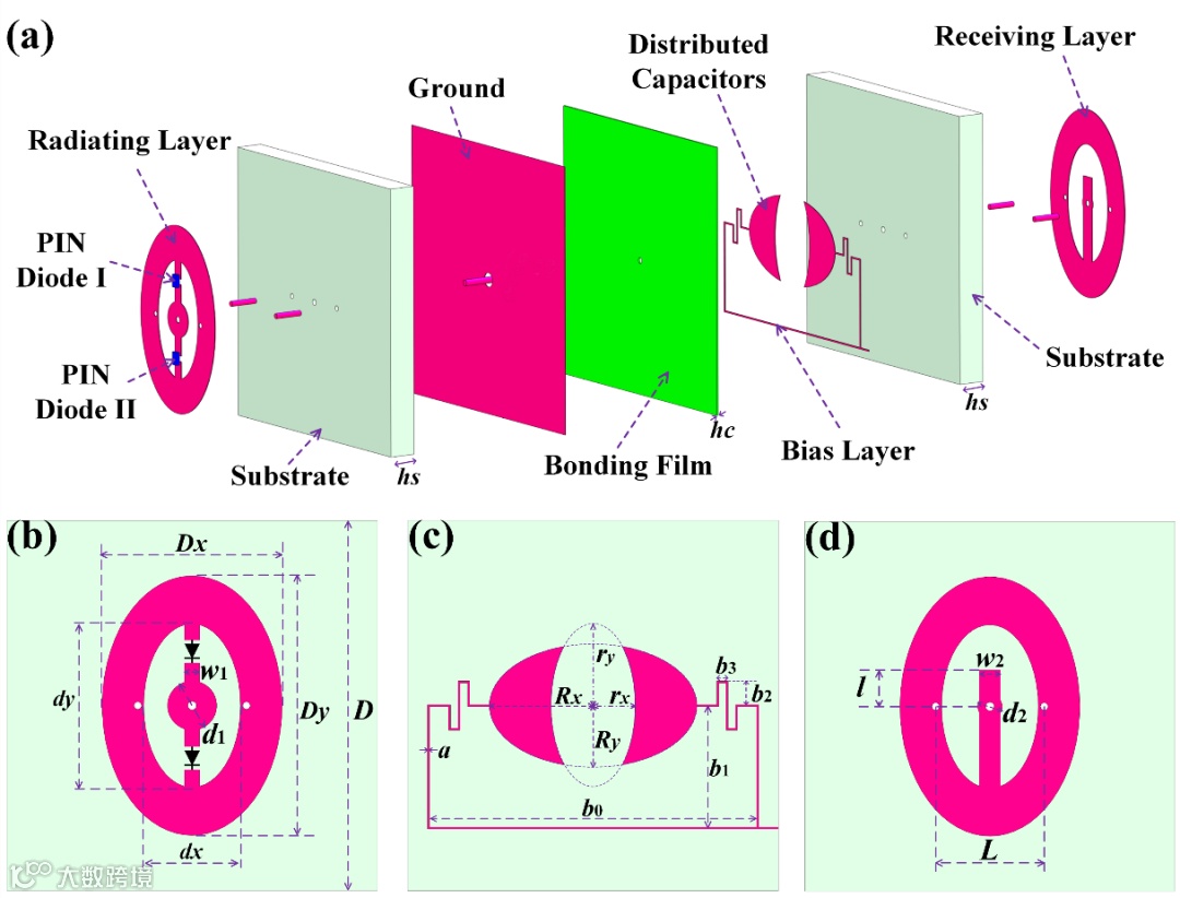 图2 透射式超表面单元结构:(a)整体爆炸图,(b)辐射层,(c)偏置层,(d)接收层。