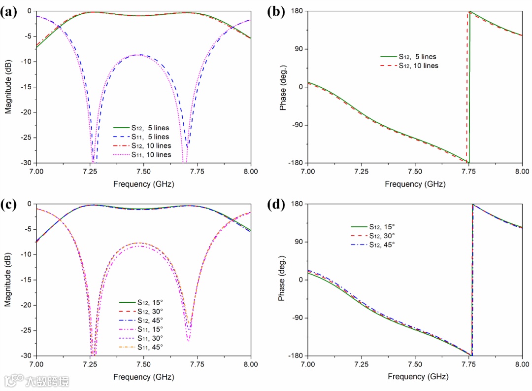 图3 单元散射参数的仿真结果。不同数目偏置线下透射系数的(a)幅值和(b)相位。不同入射角下透射系数的(c)幅值和(d)相位。