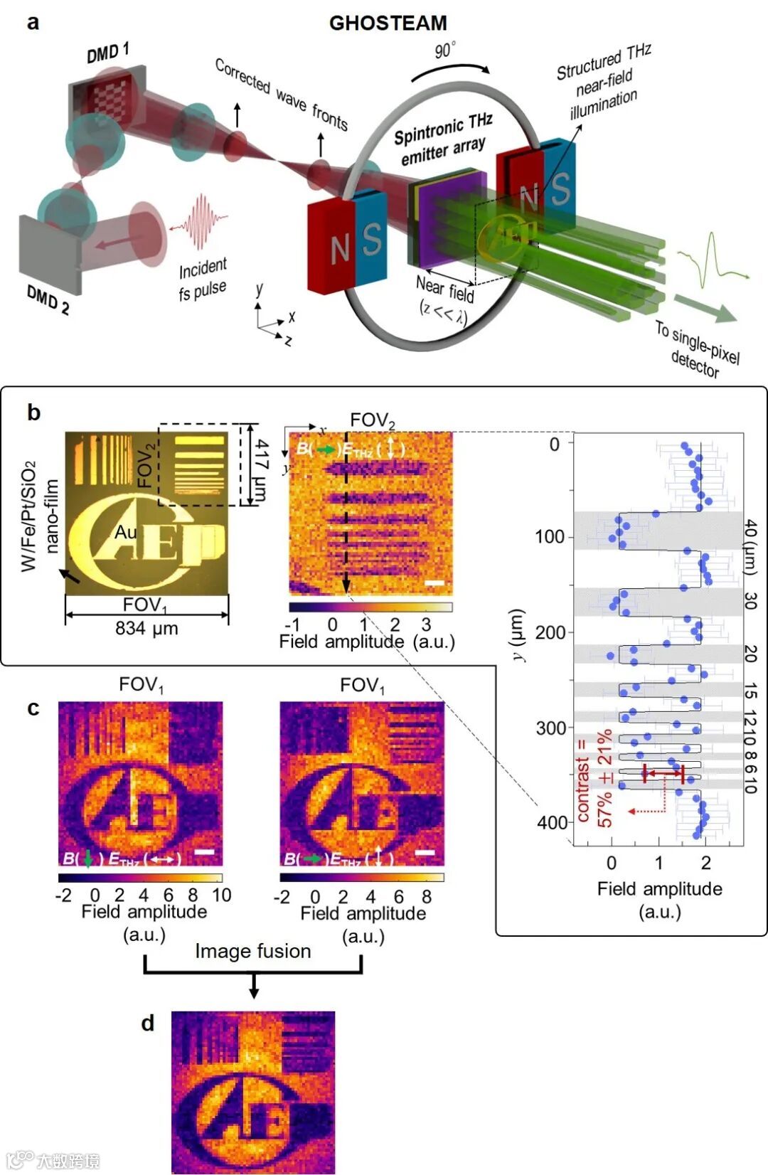 图2 a GHOSTEAM的系统示意图。将STE置于外加磁场中,当空间编码的飞秒激光激发STE时可以直接发射线偏振的结构太赫兹脉冲,其偏振方向与外加磁场方向垂直ETHz⊥B(反自旋霍尔效应)。b对太赫兹超分辨图像的定量分析,分辨率达到6.5 μm。c太赫兹波偏振态对超分辨图像的影响。d偏振融合的图像。