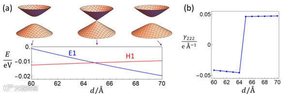 图2:(a)展示了通过调节碲化汞量子阱的厚度d实现的能隙关闭(蓝线与红线的交汇)。(b)显示了(a)中能隙关闭带来的压电常数γ的突变。