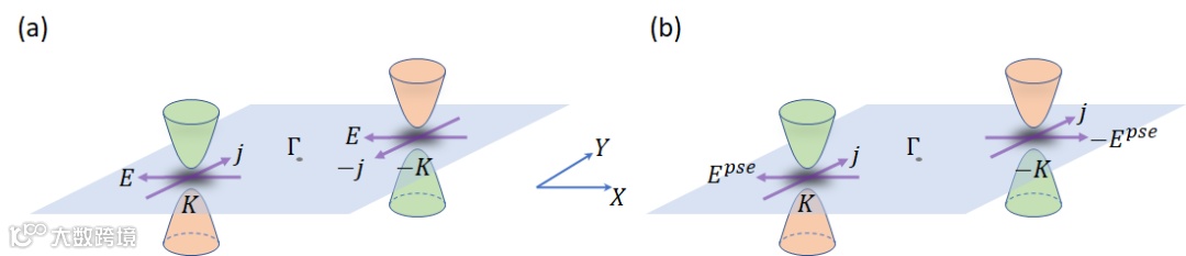 图1:这里考虑一个二维体系,其低能有效理论可以被位于K和-K的带能隙的二维狄拉克哈密顿量所描述,因而在K和-K附近会产生贝利曲率(阴影部分)。(a)沿X方向的电场E会在K和-K点附近产生沿Y方向符号相反的霍尔电流,所以总的霍尔电流为零。(b)通过含时演化的应变可以产生赝电场