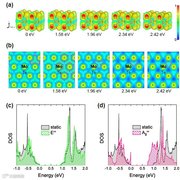 图表 4 不同激发态下2H相MoTe2电子局域函数(a)三维和(b)俯视图。电子局域函数从0到1对应于蓝色到红色。(a)中电子局域函数的等值面增量是0.2.。静态晶格DOS图(灰色)与沿着(c)E''(绿色)和(d)A2''(粉色)两个声子模式的对比图。