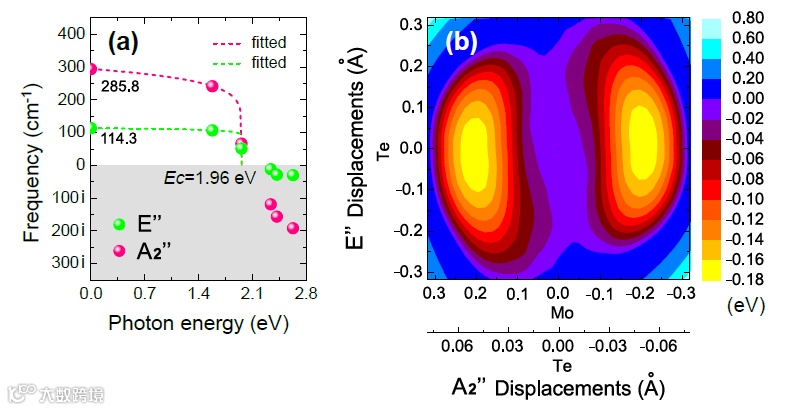 图表 3 (a)E''以及A2''模式的声子频率随着激光激发态能量的变化。(b) 二维势能面,其中横轴代表A2''模式下的约化位移,纵轴代表E''模式下的约化位移,等高线代表的是0.02 eV能量增量。