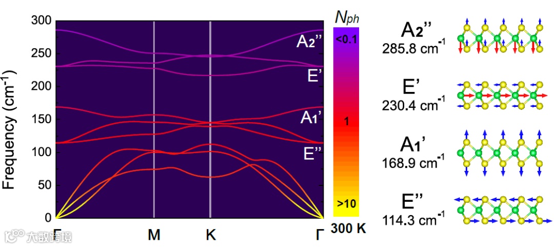 图表 1 2H相的MoTe2的声子谱以及其Γ点的原子振动模式。声子模式占据数由300 K下的波色-爱因斯坦分布决定。