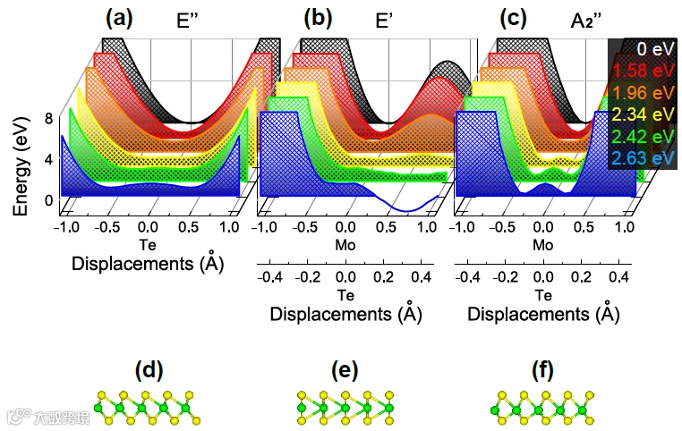 图1给出了2H相的MoTe2的声子(即晶格振动)谱,以及 E",A1',E'以及A2"振动模的原子振动图样。研究发现E"、E'以及A2"是导致结构相变的晶格振动模。图2(a)-(c)给出了这三个振动模在稳定态及各种激发态下,势垒能量随Te/Mo原子位移而改变的样子。对于E"振动模式(顶层和低层Te原子层朝着相反的方向谐振运动),随着光子激发能量的增加,势能面逐渐趋于平坦,并且在入射光子能量大于1.96 eV的时候出现双势阱结构形成亚稳态,也就是说当光激发能量超过1.96 eV时新的亚稳态会出现。图2(d)给出了新的亚稳态下Te原子新的平衡位置,显然新的亚稳态原子位置已经不同于图1给出的稳态位置。相似的情况同样出现在A2"振动模式(Mo原子存在不在面内的位移振动,且与Te原子相反),当激发能量大于1.96 eV时,Mo原子向上或向下回弹从而使整个结构达到双势阱结构的两个最低值,原子位移到图2(f)所示的新位置。对于E'模式,情况则略有区别,激发态下依然出现双势垒,但是势垒不再对称出现,原子正方向位移时势阱更深,此时原子位移如图2(e)所示。值得注意的是在2.63 eV时,E"和A2"模式都出现双阱结构二E'依然存在势垒。综上所述,上述三个声子模式的变化导致了MoTe2的2H相到