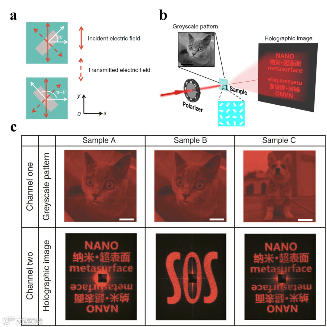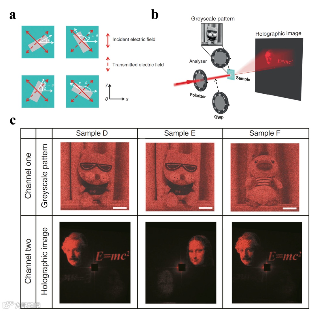 提出这种设计自由度的灵感来自于纳米结构的转角简并性(orientation degeneracy)。简并性是一个被广泛应用在物理、生物、医学以及数学领域的概念。如在量子力学领域,一个能级与一种以上的状态相对应,则称之为简并能级。分子生物学中,同一种氨基酸具有两个或更多个密码子的现象称为密码子的简并性。这种用来描述同一个映射结果下的多种状态,称之为简并性。研究团队发现,广泛用于控制入射光偏振态和强度的马吕斯定律中也存在着简并性。近年来,基于马吕斯定律的纳米结构灰度图像显示技术被广泛研究,其灰度强度调节公式可以表示为: