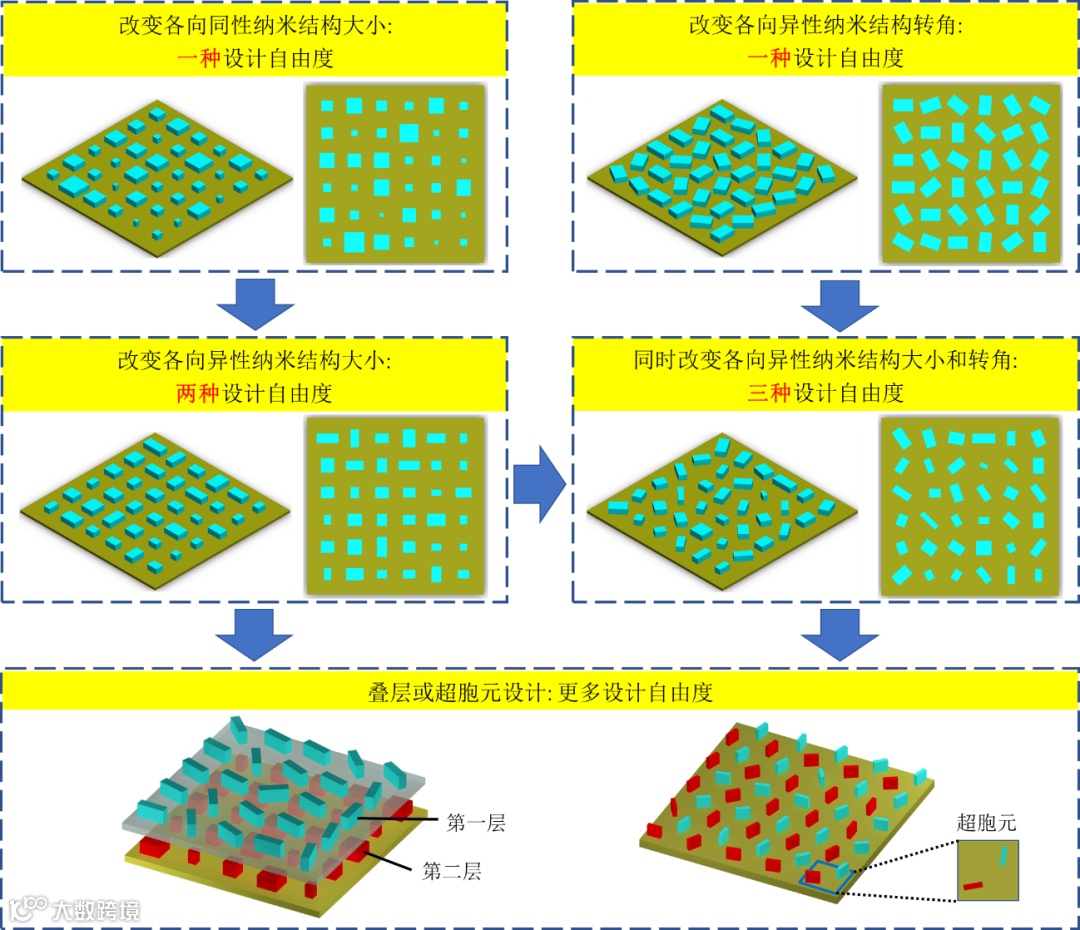 纳米结构超表面具有精密操控入射光波的相位、振幅、偏振和频率等光学特性的功能,从而在纳米尺度打开了操控光波电磁场的大门。增加纳米结构的设计自由度将赋予超表面更复杂的功能,这是科学家们一直在探讨的热点话题。早期超表面研究中,通过改变各向同性纳米结构(如圆柱、正方体等)的大小,只能提供一种设计自由度;同样通过改变各向异性纳米结构的转角,也只能提供一种设计自由度。进一步的,同时改变各向异性纳米结构两个正交方向的大小,可提供两种设计自由度;而同时改变各向异性纳米结构的大小和转角,则可以提供三种设计自由度。更多的设计自由度可以通过叠层、超胞元设计实现,但同时也增加了设计制造的复杂度和串扰。科学家关于纳米结构设计自由度的探索历程如图1所示。