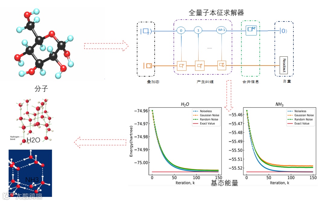 北京量子信息科学研究院和清华大学魏世杰博士、李行博士和龙桂鲁教授的全量子本征求解器采用量子化的梯度下降算法。他们把二次量子化的费米哈密顿量映射到希尔伯特空间的比特形式哈密顿量,应用量子梯度下降算法求得哈密顿量的基态能量和基态波函数。具体而言,在一个量子计算系统中,首先设定一个合适的量子初态,通过构造的量子算法给出量子线路实现对应的动力学演化,通过迭代收敛到基态,最后测量量子态得到需要的信息。图1是求解分子基态能级的过程示意,经过前期处理,相关软件计算得到分子在希尔伯特空间的哈密顿量,将特定的初态作为输入态,利用分子哈密顿量进行对应的量子逻辑门操作进行计算,最终通过测量得到分子基态能量和波函数。寻找最稳定结构在量子化学中是非常困难的工作,需要大量的计算,FQE已经可以计算,它通过变化分子中原子间的距离,找到能量最低状态,得到分子的最稳定结构。图2中展示了求解几种分子稳定结构的过程。