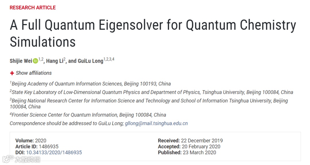 2020年2月23日,Research以 “A Full Quantum Eigensolver for Quantum Chemistry Simulations” (Research, 2020, 1486935, DOI: 10.34133/2020/1486935)为题报道了北京量子信息科学研究院和清华大学联合团队魏世杰博士、李行博士和龙桂鲁教授的全量子本征求解器(Full Quantum Eigensolver,FQE)工作。这个全量子本征求解器的量子算法,在量子计算机上计算分子基态能级和对应的电子结构,特别是它不仅可以在现在的IBM和谷歌等的有噪量子计算机上工作,而且可以直接自然过渡,在以后的大型容错量子计算机上工作。