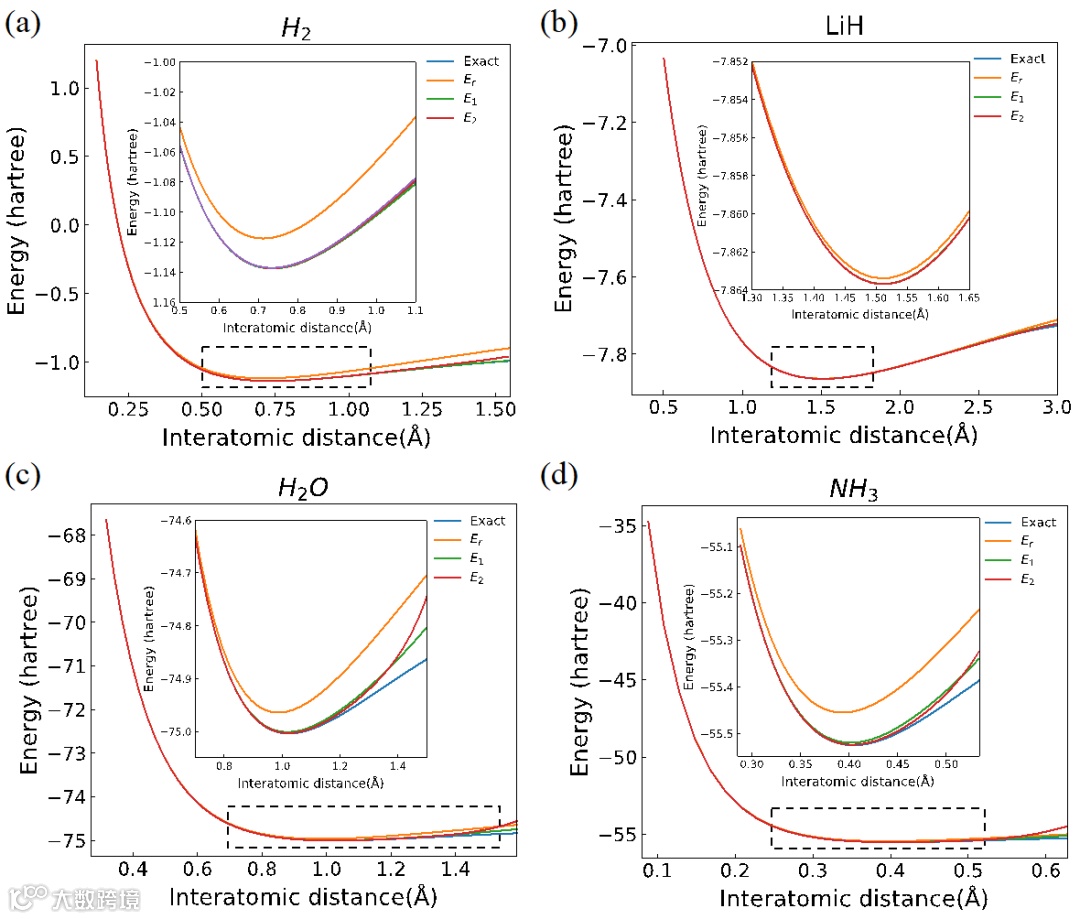 图2 以(a)氢气,(b)氢化锂,(c)水分子,(d)氨气分子为例,通过变化原子间的距离,求解分子最稳定的结构