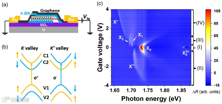 首先,研究人员在h-BN/WSe2/h-BN三明治结构器件中(图1),通过调节栅极电压可以显著调控在p-端和n-端的载流子浓度,具体可以分为电中性区域(I),激子的1s