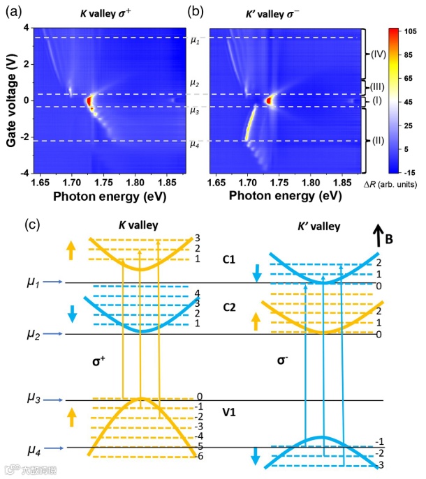其次,研究人员通过磁场下的谷分辨光反射光谱发现,由于磁场导致K和K’能量简并的破缺,导致K和K’能谷随栅极电压变化出现不对称朗道能级量子化。在K能谷,谷内的激子出现朗道能级能量量子化,而在K’能谷,谷内激子p-掺杂增强而迅速消失,同时,跨能谷的激子-极化子出现朗道能级能量量子化。