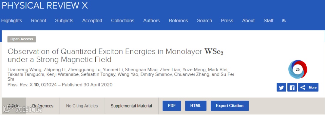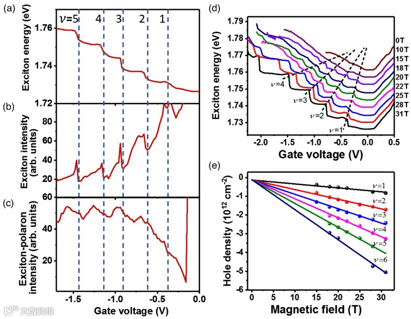 近日,美国伦斯勒理工学院史夙飞教授及其合作者在Physical Review X上发表了题为“Observation of Quantized Exciton Energies in Monolayer WSe2 under a Strong Magnetic Field”的研究论文 (Phys. Rev. X, 2020, 10, 021024)。在高质量的h-BN/WSe2/h-BN三明治结构器件中,通过静电掺杂和外加面外磁场,在强库仑相互作用系统的TMDC二维材料WSe2中首次实现激子能量量子化。由于朗道能级间独特的谷选择定则,利用磁场下的谷分辨反射光谱,研究人员发现能谷内的激子和跨能谷的激子-极化子随栅极电压的变化展现出引人注目的梯级平台。并且,激子能量量子化的梯级间距对载流子浓度变化非常敏感,显示存在显著的多体物理效应。这一工作对研究基于朗道能级间相互作用和多体物理效应的量子作用具有重要意义。
