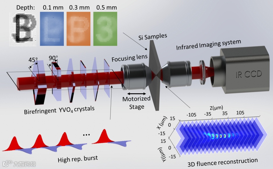 近期,法国国家科学研究院(CNRS-LP3)David Grojo课题组使用钒酸钇(YVO4)双折射晶体组产生重复频率高达太赫兹的飞秒激光脉冲序列,实现硅内部载流子及热量在光斑内部的快速累积,从而突破了利用普通透镜实现深硅烧蚀的难题,以题为 “Ultrafast Laser Writing Deep inside Silicon with THz-Repetition-Rate Trains of Pulses”发表在Research上 (Research, 2020, 8149764, DOI: 10.34133/2020/8149764)。