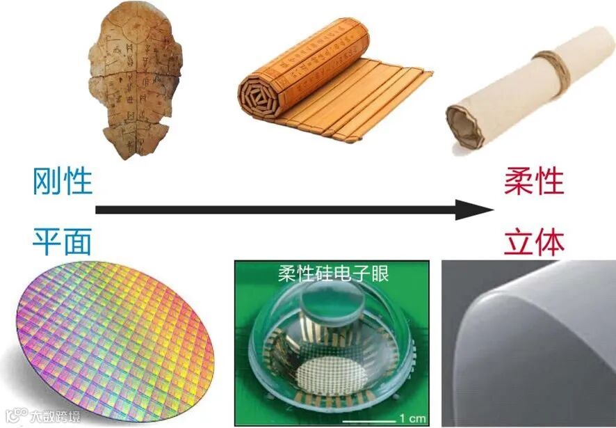 无论如何,柔性材料的发展,让我们很容易通过弯曲或折叠,在三维空间中产生丰富的结构和功能。这当然不是什么新潮的理念,在人类创造和发展历程中比比皆是。图 3 所示即是材料从平面向三维柔性化空间发展的两个直观例子:(上) 从石器、到竹简、再到皮革与纸张;(下) 从硅集成电路板到柔性塑料基底的电子纸。