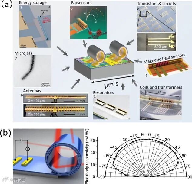 图9. 卷曲结构制备的微纳元器件 [7, 8],注意到三维管状结构提供了平面结构无法实现的空间全角度探测能力。