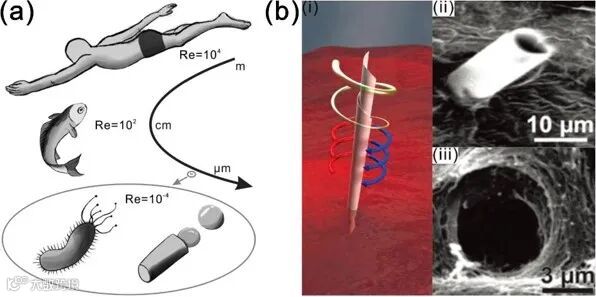 图10. (a) 不同尺寸下的物体在液体环境中的运动及其雷诺数。(b) 用于微创手术的卷曲管状微纳马达。详细可见文献 [9, 10]。(附有动画)