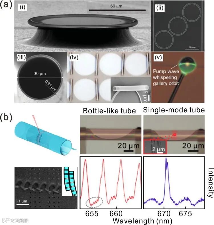 图8. 卷曲管状结构的回音壁光学谐振腔 [5, 6]。(a) 给出了不同形状的回音壁光学谐振腔。(b) 展示了由卷曲管状光学谐振腔与光子晶体结合实现的单模筛选。