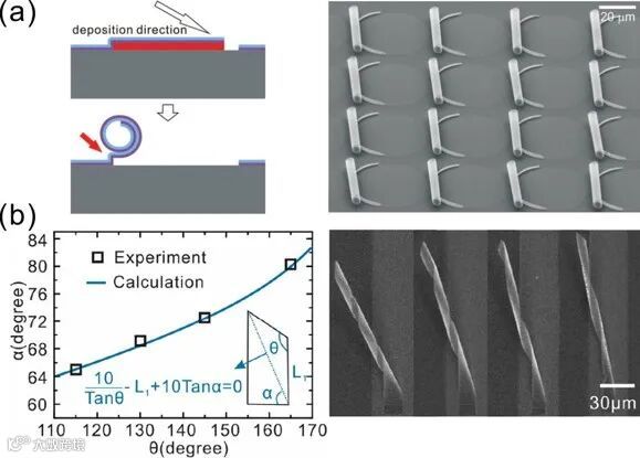 图5. 卷曲行为的控制 [1, 2]。(a) 倾斜蒸发下的薄膜定向卷曲。在牺牲层腐蚀后薄膜全部沿同一方法进行卷曲。(b) 楔形图形设计下的卷曲方向控制。不同的楔形倾角可以制备出螺距不同的弹簧卷曲结构。(附有动画)