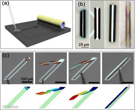 图7. 微液滴诱导层离法实现薄膜的三维定向卷曲 (a)。这一方法在实现多种材料的卷曲结构制备 (b) 的同时提供了制备结构的高度可控性 (c) [4]。(附有动画)