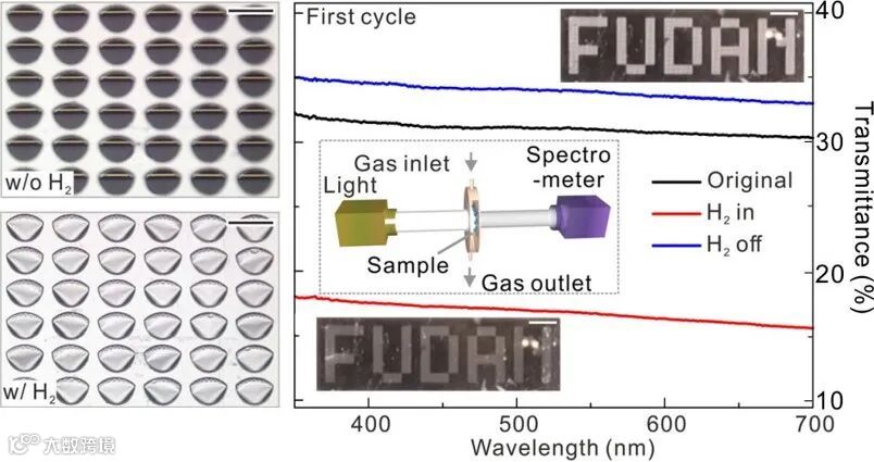 可以看到,在氢气中,卷曲的管状结构迅速转变为平面的薄膜结构,由此改变整个薄膜的颜色和透过率。这一功能似乎可以用来对氢气泄露进行没有任何电信号输入的检测,避免了引入电信号时可能产生的电安全隐患,真是奇巧之至。