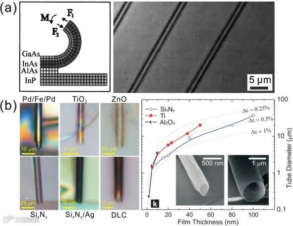 图6. 通过选择性腐蚀单晶 AlAs 层 (a) 或光刻胶层 (b) 释放薄膜自卷曲形成各种薄膜材料的管状结构及管径控制 [1, 3]。