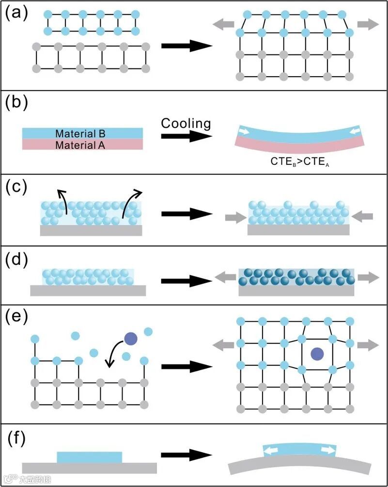 图4. 薄膜产生内应力的原因:(a) 界面效应;(b) 热应力;(c) 缺陷效应;(d) 相变;(e) 掺杂效应;(f) 外力作用。