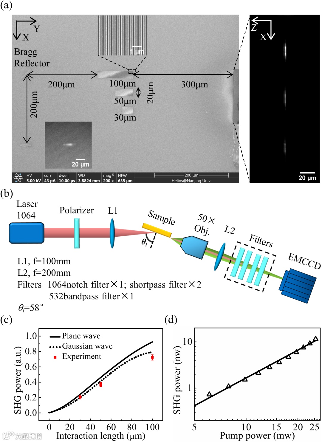 图2. 样品加工和实验表征。(a)不同长度仅实现倍频过程的样品SEM图和波导端面耦出光斑。(b)实验表征光路示意图。(c)实验测量倍频光输出能量和仿真结果对比。(d)实验测量倍频光能量随基波光能量平方线性增长关系。