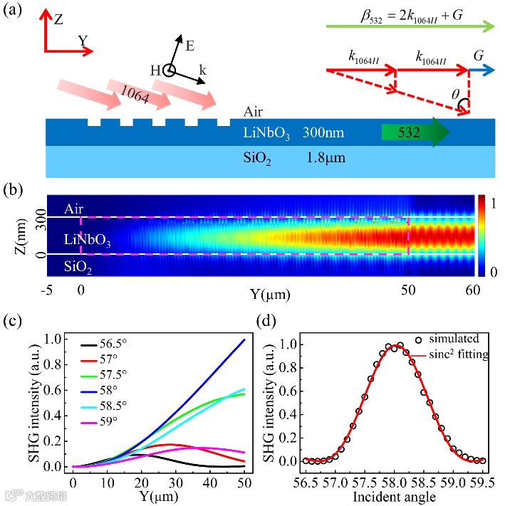 图1. 理论设计和仿真。(a)相位匹配过程示意图。(b)FDTD仿真的倍频光场在波导内的演化。(c)FDTD仿真的不同入射角度下倍频光能量积累过程。(d)FDTD仿真的倍频光输出能量与入射角度的关系。