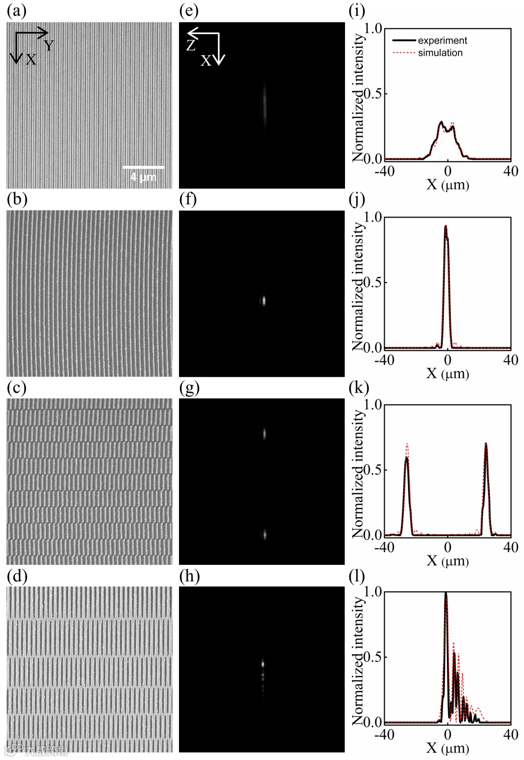 图3. 倍频导波光波前的灵活调控。(a)(e)(i)普通实现倍频功能;(b)(f)(j)实现倍频光的聚焦功能。(c)(g)(k)实现倍频光双聚焦功能;(d)(h)(l)产生倍频的艾里光束。