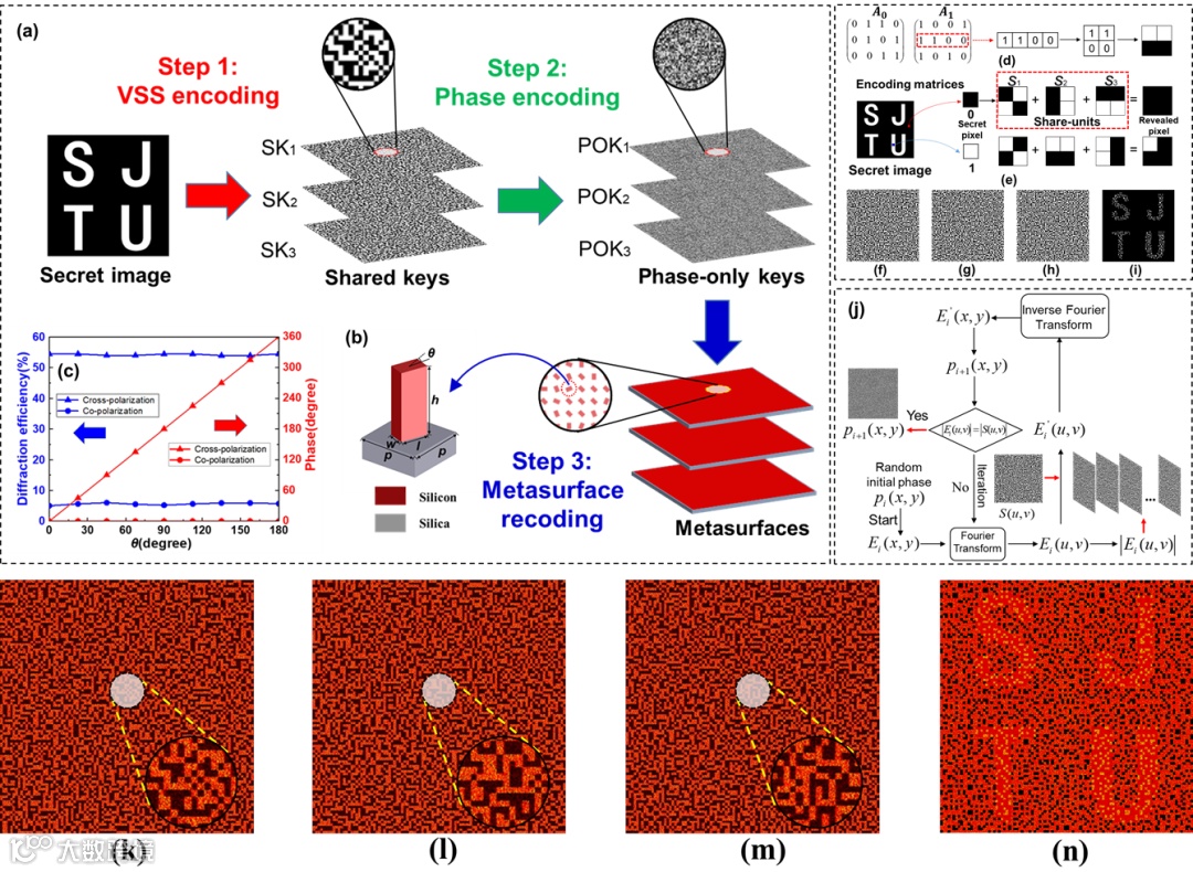 图2. (a)基于多个单通道超表面的SSPE方案的加密原理。(b)超原子单元。(c)交叉极化和共极化方向的效率和相位。(d-i) (3,3) VSS方案的原理。(j)相位编码算法流程图。(k-m) 单个超表面的解码结果。(n) 秘密信息的恢复结果