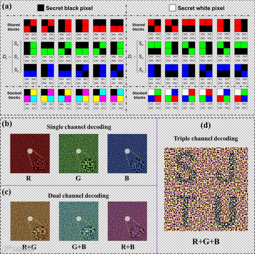 在解码过程中,由于多波长SSPE方案的解码与波长相关联,不同波长分量的组合可以提取到不同颜色的共享像素块。为了方便,我们使用(RGB)来描述不同颜色的共享像素块。理论上,堆叠的共享像素块应该由不同的颜色组合而成。图4(a)显示了译码矩阵的6/24种可能的组合图解:如果秘密像素为白色,则SR,SG和SB的叠加结果将以红色,绿色,蓝色和白色块的随机组合呈现,而青色,黄色,品红色的任意组合和黑色像素块将显示为秘密黑色像素。图4(b-d)显示了由上述多色译码矩阵解密下的单通道、双通道和三通道的仿真恢复结果。很显然,只有在全通道解码过程中才可恢复原始图像,而在其他非全通道解码中则只能提取到无意义的图像。