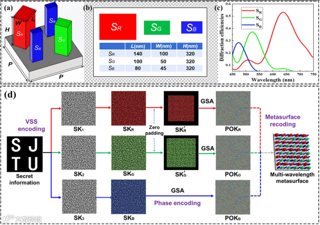 在这项工作中,研究人员首次提出了一种新颖的秘密共享相位编码方案(SSPE),该方案将视觉秘密共享编码技术与多波长超表面相位编码技术相结合,首先将目标信息分解为一组看似随机且互不相关的共享密钥,然后将其转换为相应的纯相位密钥,最后由多波长超表面进行编码。在解密过程中,只能通过解码所有波长通道并依次执行“或”运算 ,即可重建秘密信息。同时,在其他非全通道解码过程中只能提取混沌图像,而不会透露任何原始信息。