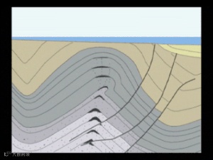 圣芭芭拉海峡挤压缩短过程中,油气向上运移和在背斜转折端富集的过程