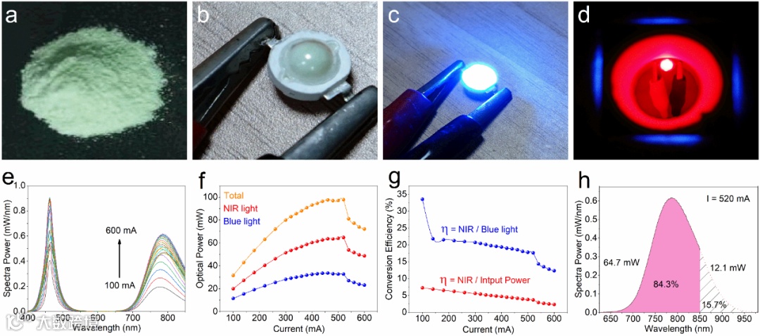 图4 a为CSSG:Cr3+近红外荧光粉;b为采用该粉体封装的NIR-LED;c和d分别为器件点亮后的照片;e-f为器件性能。