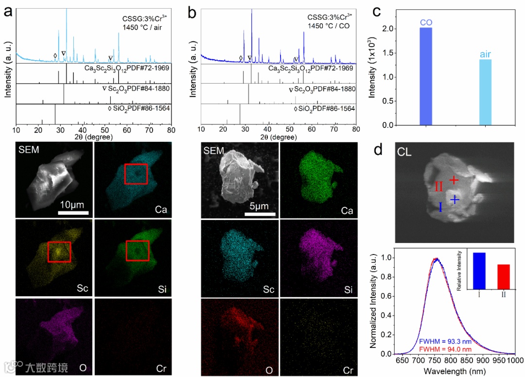 图2 空气(a)和CO还原气氛下(b)制备的CSSG:Cr3+样品的XRD、SEM、EDS元素分布,XRD衍射峰强度(c)、SEM-CL单颗粒发光(d)。