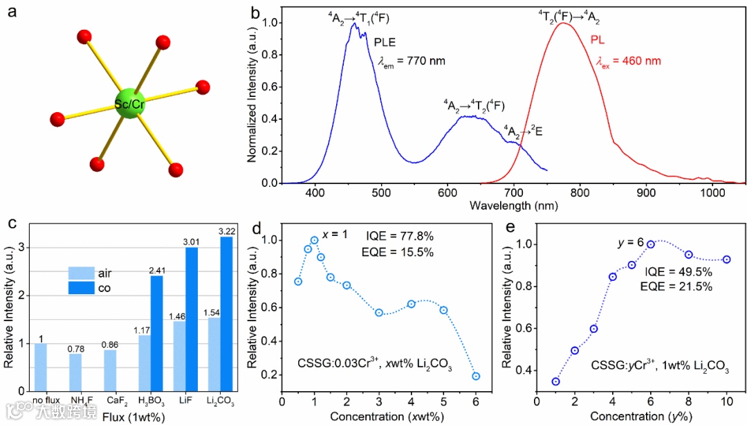 图1 (Sc/Cr)O6配位环境(a)、CSSG:Cr3+的激发发射光谱(b)、烧结气氛和助熔剂对发光强度的调控(c-e)。