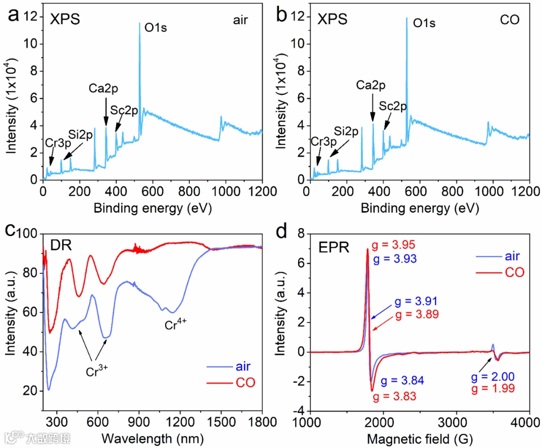 图3 空气和CO还原气氛下制备的CSSG:Cr3+样品的XPS、DR、EPR结果。