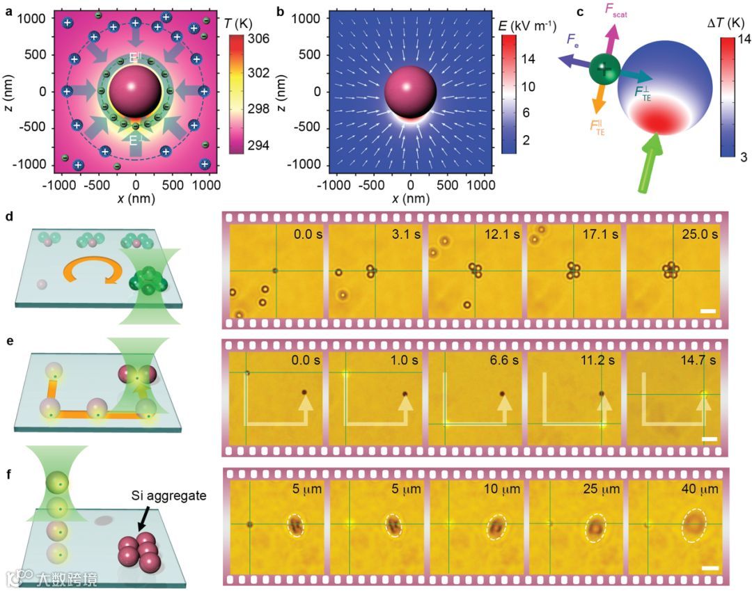(e)激光透过硅团聚物实现单个700nm硅颗粒的三维动态操控。比例尺为5 μm。
