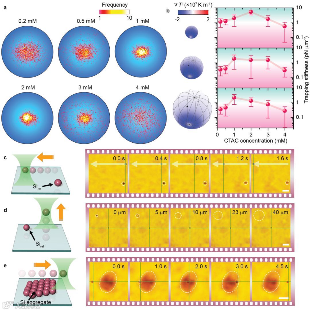 (a)单个500 nm硅颗粒在不同浓度CTAC溶液中热电光学自操控的位置分布轨迹图。
